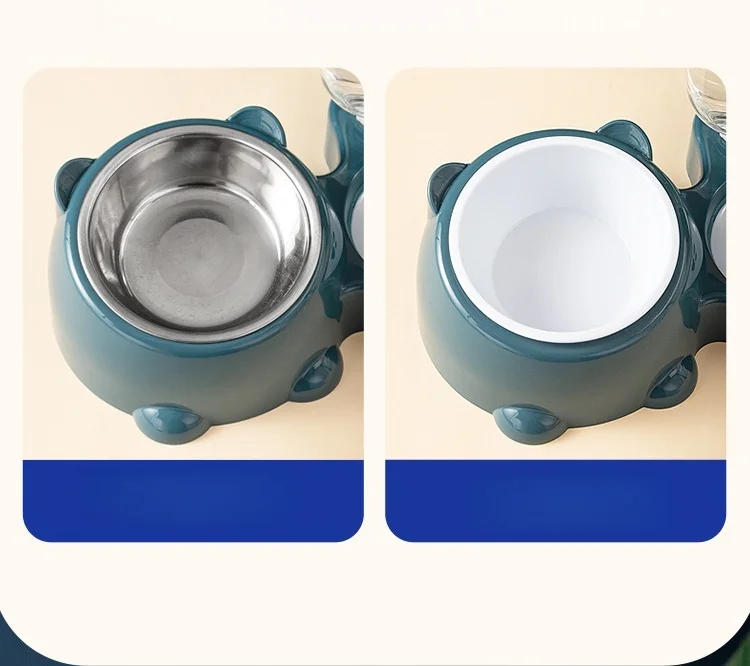 This cat bowl features a unique 2-in-1 design, combining a water bowl and food pot, providing convenience for pet feeding.